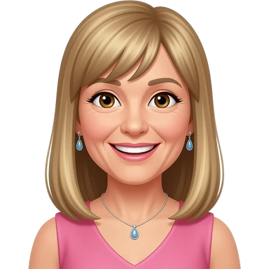 female, 50's, fringe, blonde highlights, straight long hair, straight fringe, earrings, brown eyes, pink dress, smile with teeth, neclace emoji