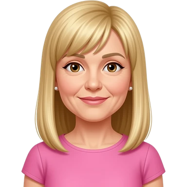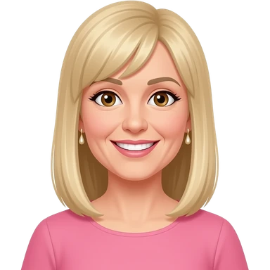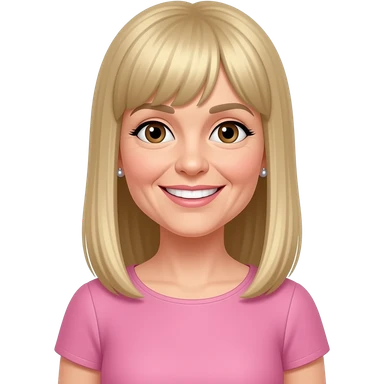 female, 50's blonde straight long hair with straight fringe, earrings, brown eyes, pink dress, smile with teeth emoji