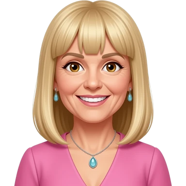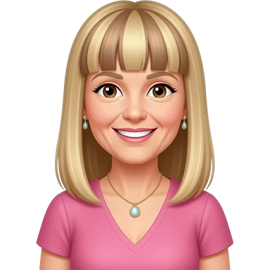female, 50's, fringe, blonde with brown highlights, straight long hair, straight fringe, earrings, brown eyes, pink dress, smile with teeth, neclace emoji