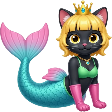 Femboy black anthro cat #B8FFFF mermaid tail with pink fins and long pink gloves yellow hair crown green swimsuit emoji