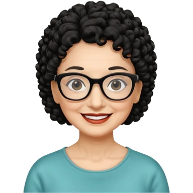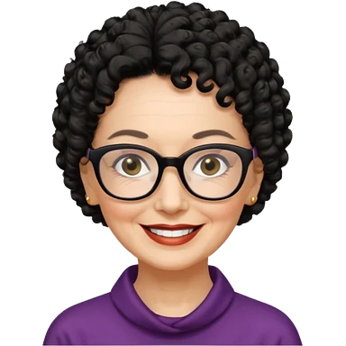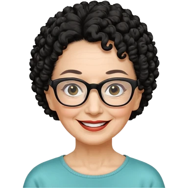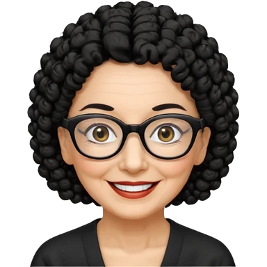 femme 70 ans cheveus noir bouclé attachés, lunettes rectangles noir yeux noir et sourrir emoji