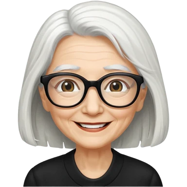femme 60ans avec de long cheveux blanc et des lunettes rectangles noir sourrir emoji