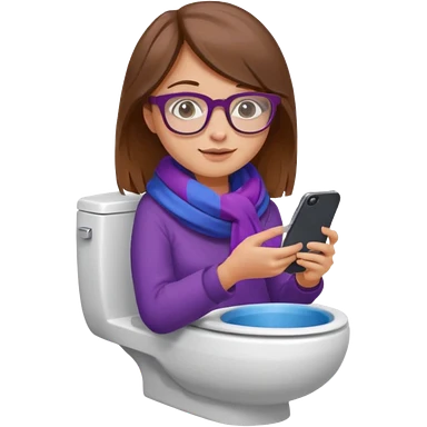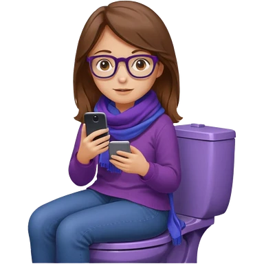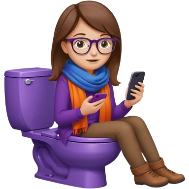 Fille châtain peau blanche avec lunettes. Elle porte une grosse écharpe violette, bleu et orange. Elle assise dans une cuvette de toilette. Téléphone en main. Realiste emoji