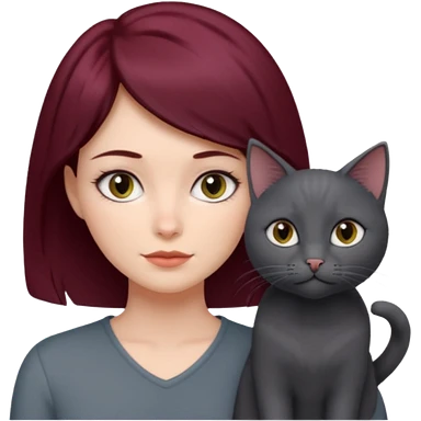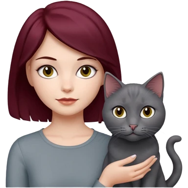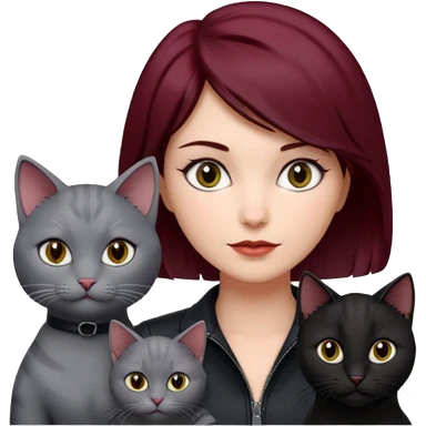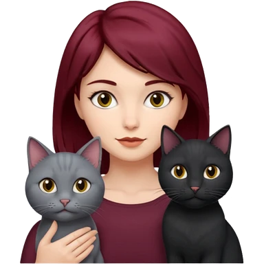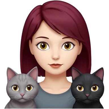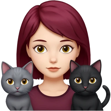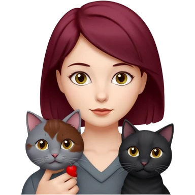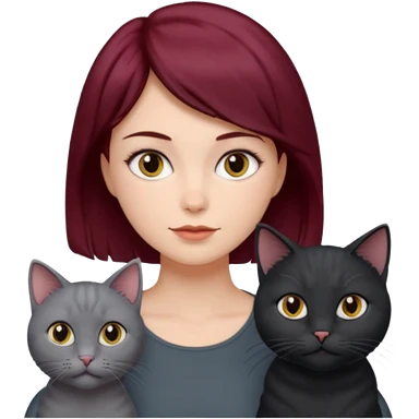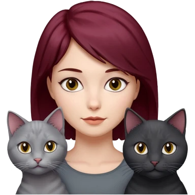 femme au cheveux court bordeau, yeux gris, avec chat poils longs gris et chat poils ras noirs emoji | AI Emoji Generator