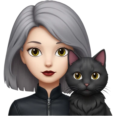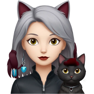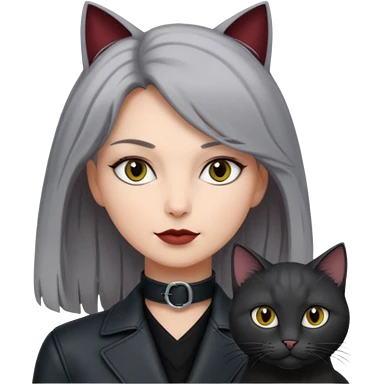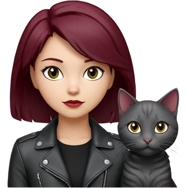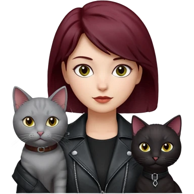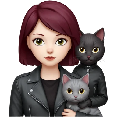 femme yeux gris, cheveux court bordeaux, cuir noir, avec chat poils longs gris clair et chat poils ras noirs emoji