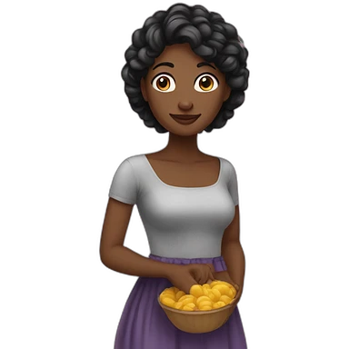 femme avec des cheveux bouclés, bruns et volumineux, légèrement tirés vers l'arrière. Le visage a une expression douce et tranquille, avec des yeux sombres et un léger sourire. emoji
