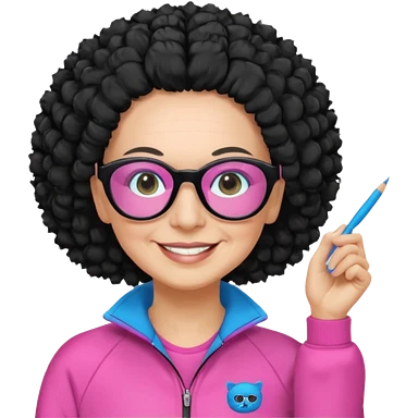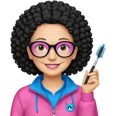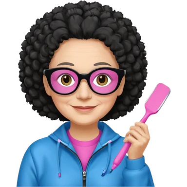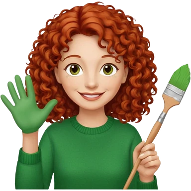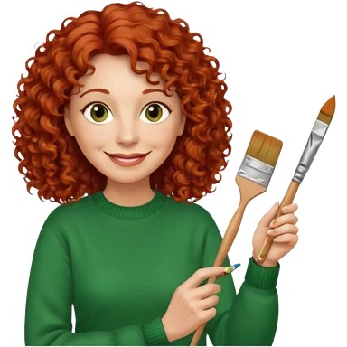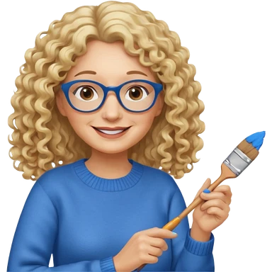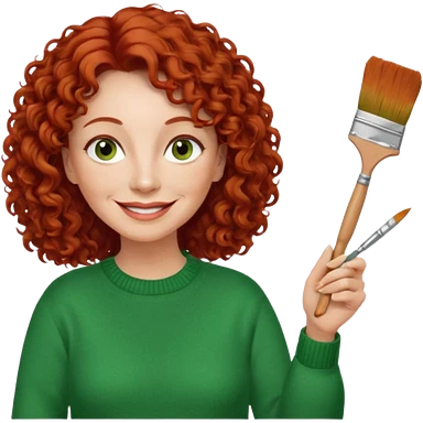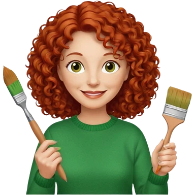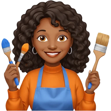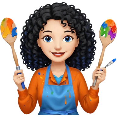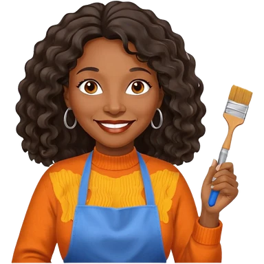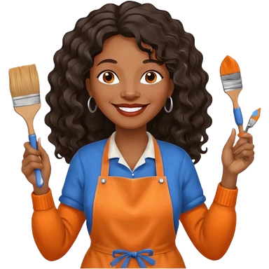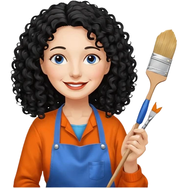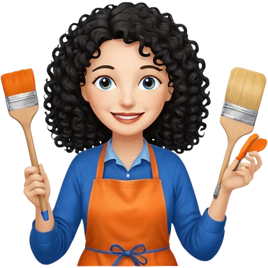 FEMME BLANCHE FRISÉ 60 ANS CHEVEUX NOIR FRISÉ ONDULÉ TRÈS LONG , SOURIANTE AVEC CHANDAIL ORANGE , YEUX BLEU ET UN PINCEAU À LA MAIN LA MAIN AVEC 5 DOIGT SEULEMENT ET TABLIER emoji | AI Emoji Generator