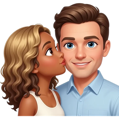 Femme métisse yeux marrons cheveux bouclés marrons et blonds qui embrasse un homme blanc cheveux châtain avec des yeux bleu emoji