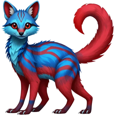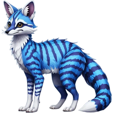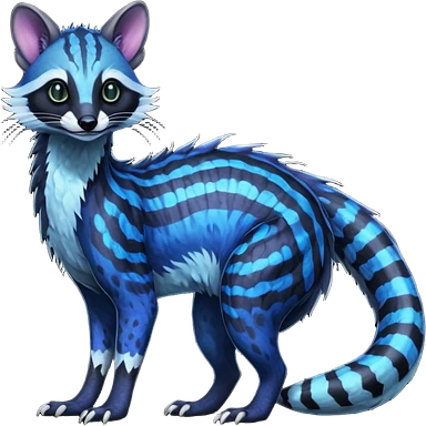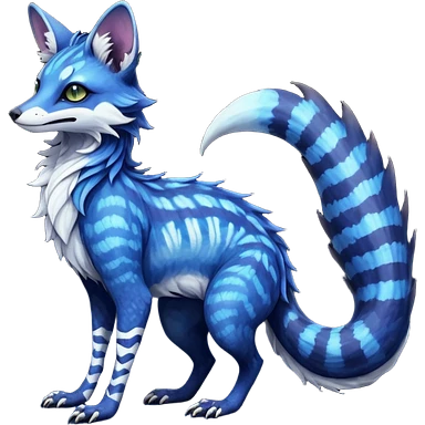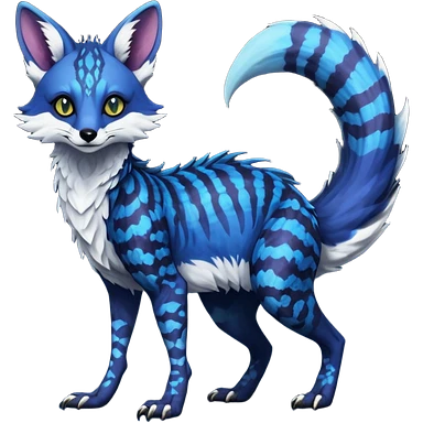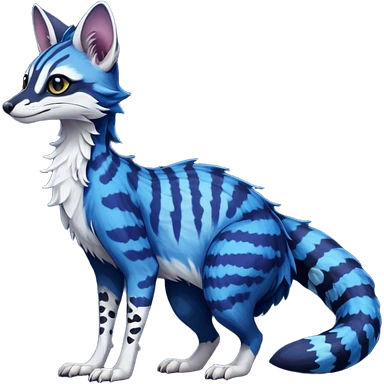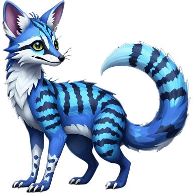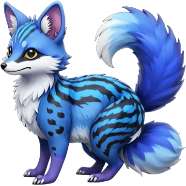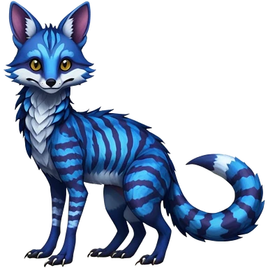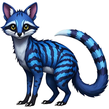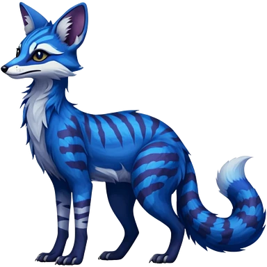 Feral chubby floofy fluffy puffy furry Rare Fantasy vibrant dark shady shaded detailed deep-dark-cobalt-blue-gradients-colored colorful Vernid-Sergal-Genet-Trico-Fox-species by LiLaiRa, with dark-blackish points, white belly, random markings, tufted tail, tufted ears, full bodyemoji