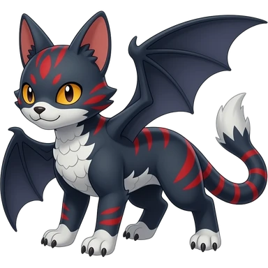 with red markings, white belly, scaley scaly batty feline-like quadrupedal digitigrade furry feral Bastet-Noibat-Gatomon-Garchomp-Digimon-Fakémon-Pokémon-creature (full body) emoji