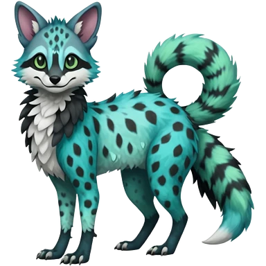 Feral Rare Fantasy minty-cyan Hunter-forest-green Vernid-Gremz-Numbat-Sergal-Genet-Trico-species by LiLaiRa, random markings, tufted tail, tufted ears, full body emoji