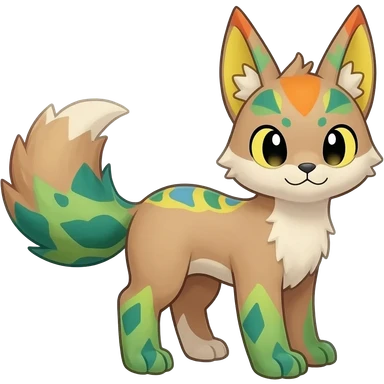 Feral Rare Fantasy colorful vibrant Vernid-Trico-species-Fakemon-creature by LiLaiRa, random markings, tufted tail, tufted ears, full body emoji | AI Emoji Generator