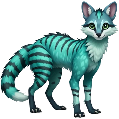 Feral Rare Fantasy dark pastel black-blue-turquoise-green-white-gradients Vernid-Sergal-Genet-species by LiLaiRa, random markings, tufted ears, full body, 4 legs emoji | AI Emoji Generator