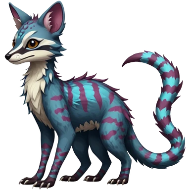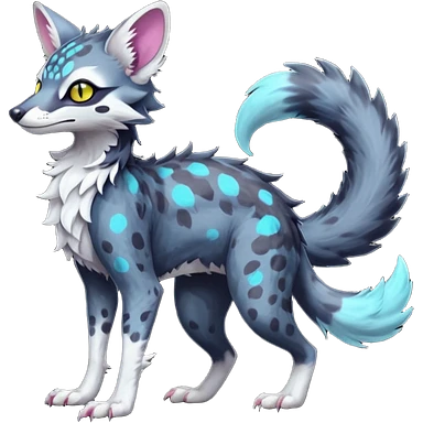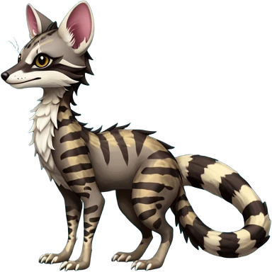 Feral Rare Fantasy dark tropical Vernid-Sergal-Genet-Trico-species by LiLaiRa, random markings, tufted tail, tufted ears, full body emoji | AI Emoji Generator