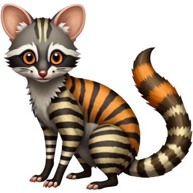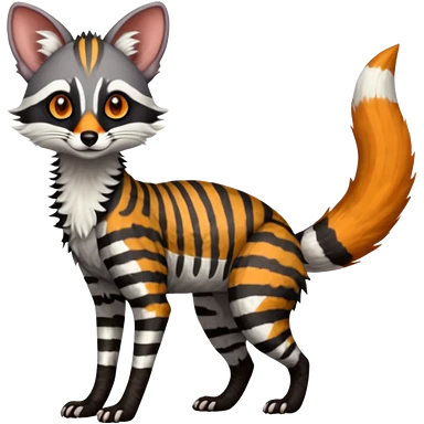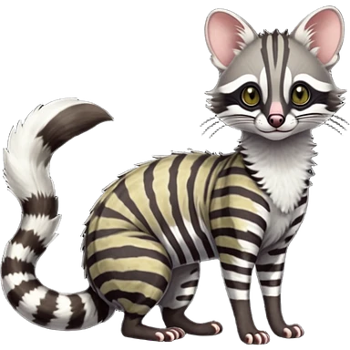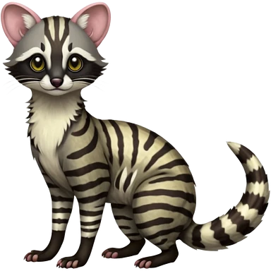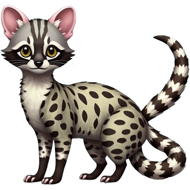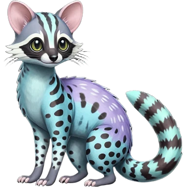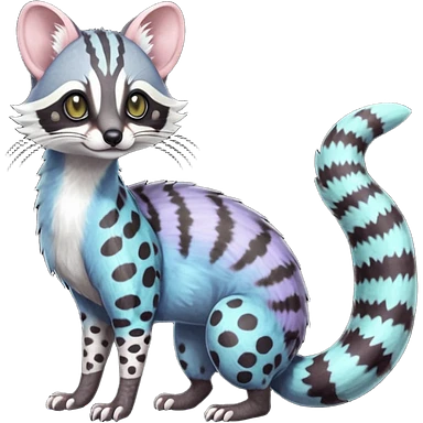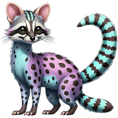 Feral Rare Fantasy iridescent scaly evil spooky vibrant dark shady shaded detailed deep pastel-gradients-colored colorful Genet-Trico-Civet-Cacomistle-Margay-species by LiLaiRa, with dark-blackish points, white belly, random markings, tufted tail, tufted ears, full bodyemoji