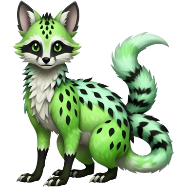 Feral Rare Fantasy neon-green fur with obsidian-onyx-black points and snowy-white belly Vernid-Sergal-Genet-Trico-species by LiLaiRa, random markings, tufted tail, tufted ears, full body emoji | AI Emoji Generator