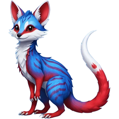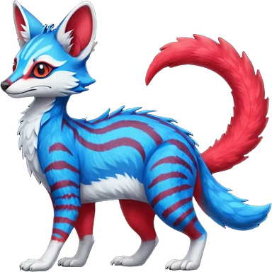 Feral Rare Fantasy vibrant cyan-cobalt-blue-crimson-red-gradients-colored colorful Vernid-Sergal-Genet-Trico-species by LiLaiRa, random markings, tufted tail, tufted ears, full body emoji | AI Emoji Generator