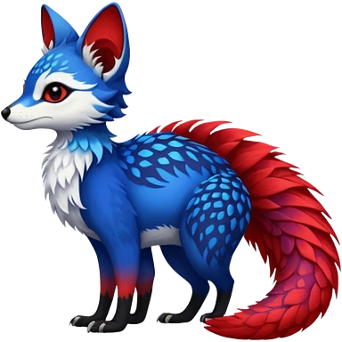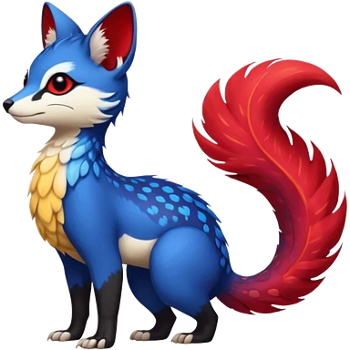 Feral Rare Fantasy vibrant tropical exotic cobalt-blue-crimson-red-black-white-yellow-gradients, Vernid-Trico-species-creature by LiLaiRa, random markings, tufted tail, tufted ears, full body emoji | AI Emoji Generator
