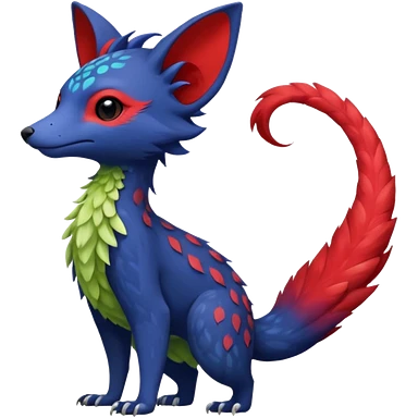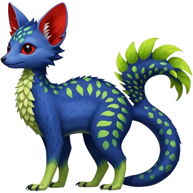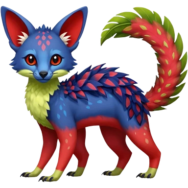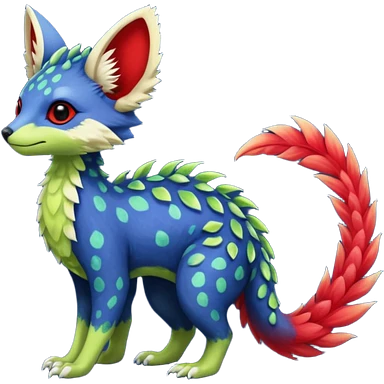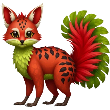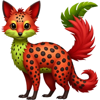 Feral Rare Fantasy vibrant tropical red and indigo and lime-collred Vernid-Trico-species-creature by LiLaiRa, random markings, tufted tail, tufted ears, full body emoji | AI Emoji Generator
