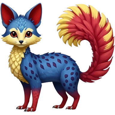 Feral Rare Fantasy vibrant tropical red and indigo and lime-colored Vernid-Trico-species-creature by LiLaiRa, random markings, tufted tail, tufted ears, full body emoji | AI Emoji Generator