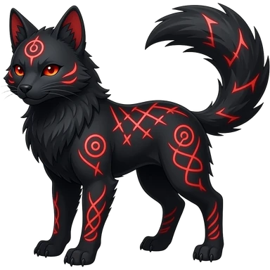 Feral Rare Fantasy dark obsidian-black fur with crimson glowing runic markings Vernid-Sergal-Genet-Trico-species by LiLaiRa, random markings, tufted tail, tufted ears, full body emoji