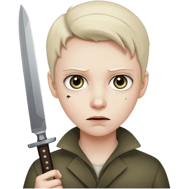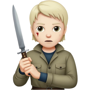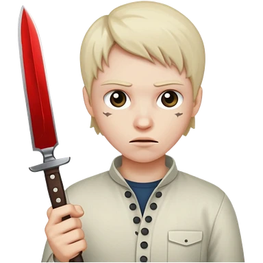 A peach skin man with purple hair and a green jumpsuit that has the number 230 on the jumpsuit and he is holding up a fork that has red paint dripping on it emoji
