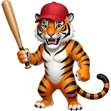 fierce orange tiger with black stripes wearing a red baseball cap, holding a bat, cute cartoon emoji style emoji