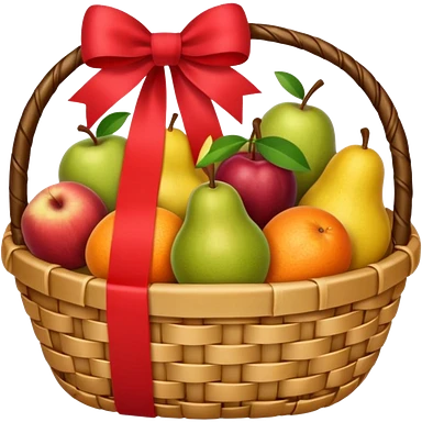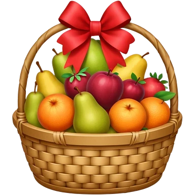 A luxury basket with wrapped fruits and ribbon bow. emoji