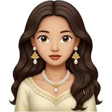Tan Filipino woman with dark brown eyes and long dark wavy hair parted in the middle wearing a traditional filipiniana and white pearl stud earrings emoji