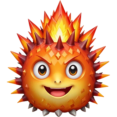 spiky mineral rock characterA single spiky crystal rock character, compact and round with many chunky flame-like spikes, glowing red–orange–yellow gradient like fire, faceted crystal texture, cute face with big shiny eyes and excited smile, emoji