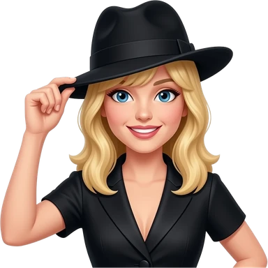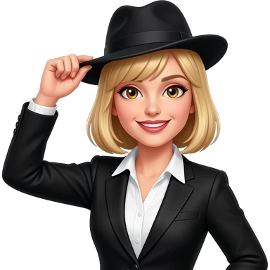 blond woman tipping hat wearing sophisticated woman's clothes add bangs knowing smile hazel eyes emoji