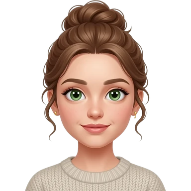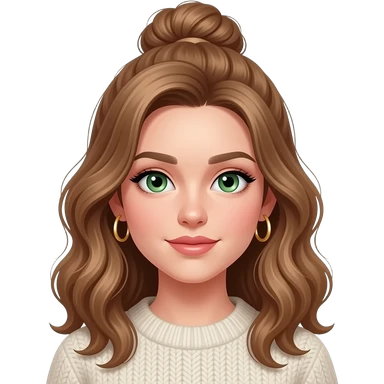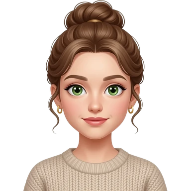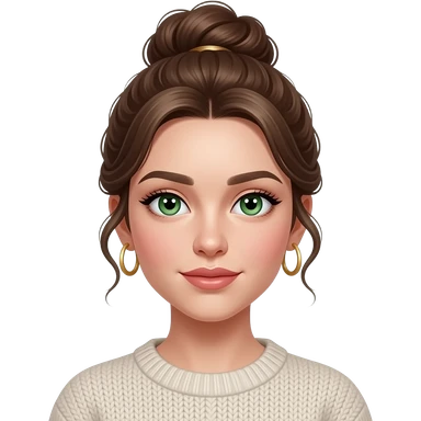 fille cheveux bruns clair 18 ans, yeux verts, cheveux en chignon haut ondulés,maquillage, botox, pull, anneaux dorés aux oreilles emoji