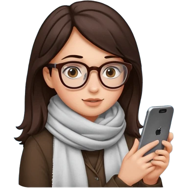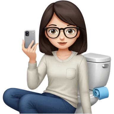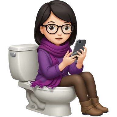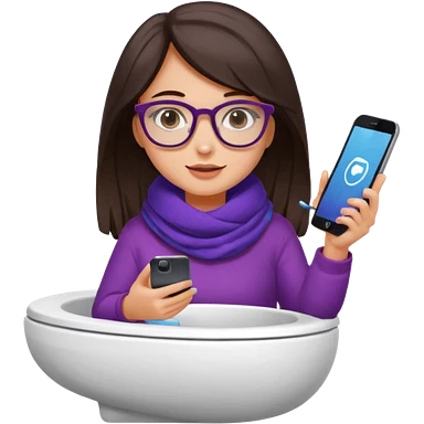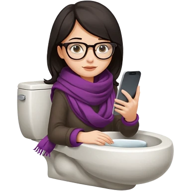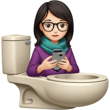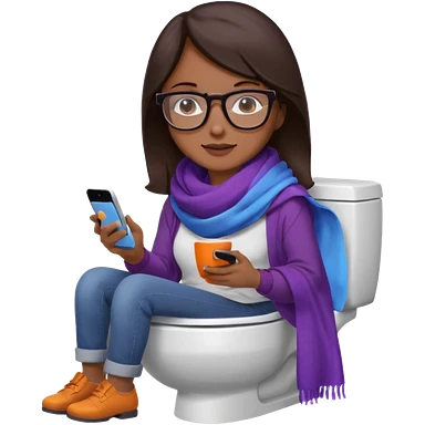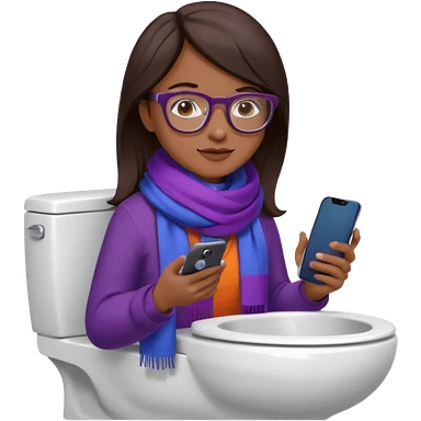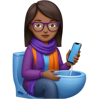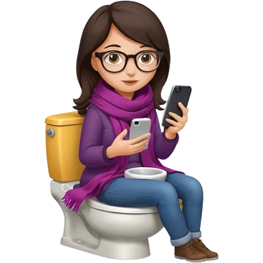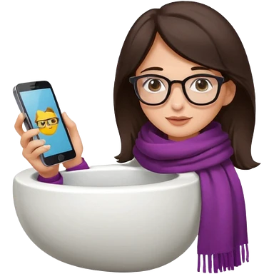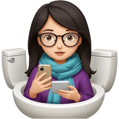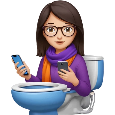 Fille châtain peau blanche avec lunettes. Elle porte une grosse écharpe violette, bleu et orange. Elle assise dans une cuvette de toilette. Téléphone en main. Realiste emoji | AI Emoji Generator