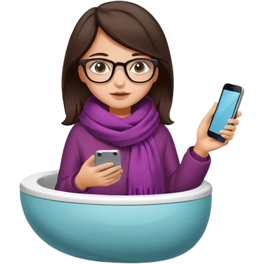 Fille châtain peau blanche avec lunettes. Elle porte une grosse écharpe violette, bleu et orange. Elle assise dans une cuvette de toilette. Téléphone en main. Realisteemoji