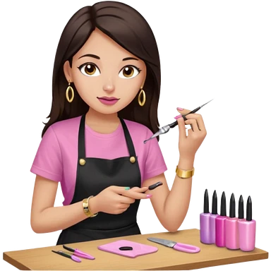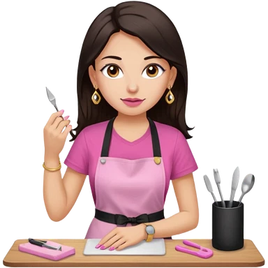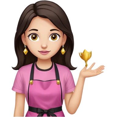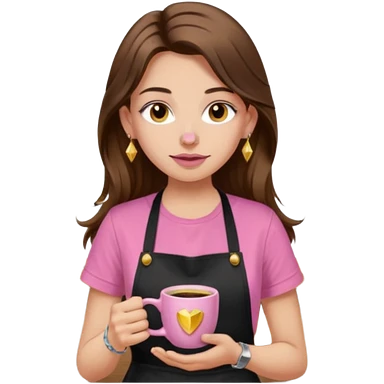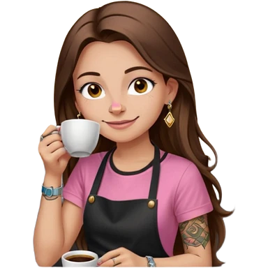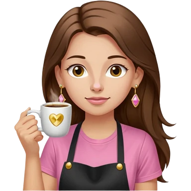 Fille cheveux long châtain, peau beige type européen, teeshirt rose avec un tablier noir, piercing au nez anneau doré, boucle d’oreille diamant doré. Elle boit un café. tatouage à la gorge emoji | AI Emoji Generator