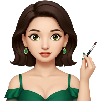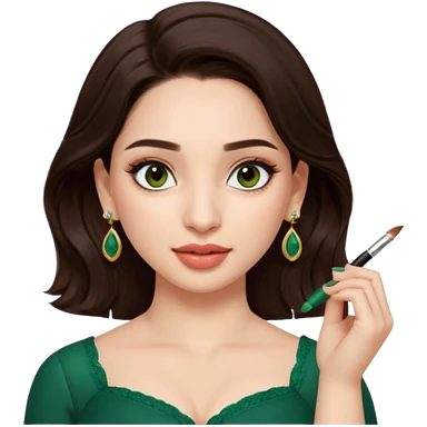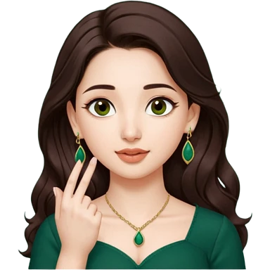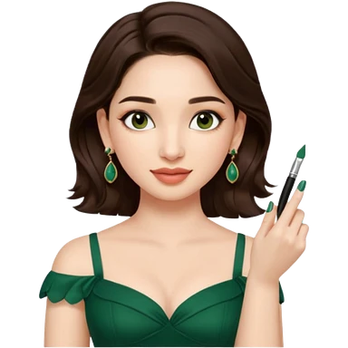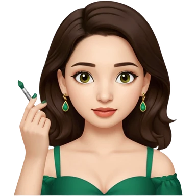 pretty bratz genmoji that looks like tamannah bhatia (bollywood actress), wearing a dark green sweetheart neckline top, dark brown hair, light makeup, no necklace, dangly earrings, side hair part, fair. dark brown eyes Show her applying something on her face with a finger emoji
