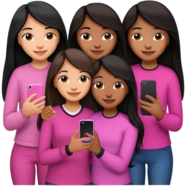 3 brown girl friends with a phone on their hand, one with black long hair light skin, one with brown hair long and the other one with black with brown medium length hair . Wearing pink glammed up and hugging emoji