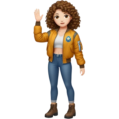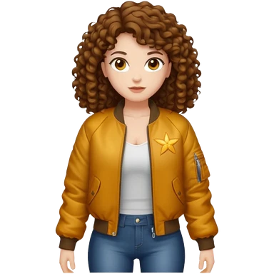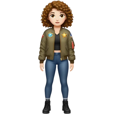 full body woman short curly brown mullet brown eyes white skin muscular build firefly bomber jacket emoji