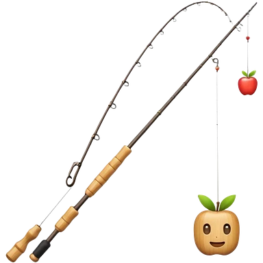 Genmoji-style bamboo fishing rod emoji, simple beginner rod, smooth rounded Apple-style shapes, soft gradients, small reel, exactly one fishing line hanging from the tip, 3/4 angle, clean silhouette, no hook, no text, transparent background emoji