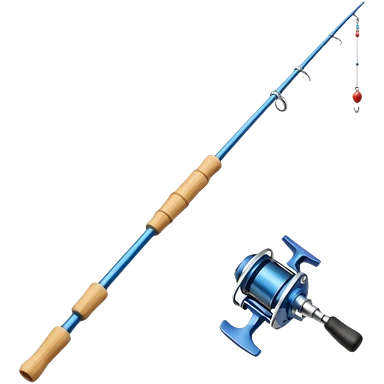 Icon for Fishing: a fishing rod with a line in the water, a tackle box, a fish on the hook, and a peaceful lake or river background. The icon should capture the calm and skill of fishing. Transparent background. emoji