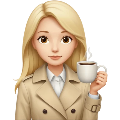 Cewe Kalem Kulit putih halus, rambut blonde panjang lurus rapi, belah samping. Pakai trench beige terang atau cream soff pegang kopi emoji