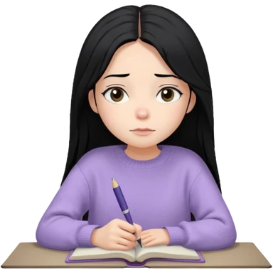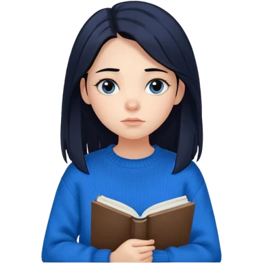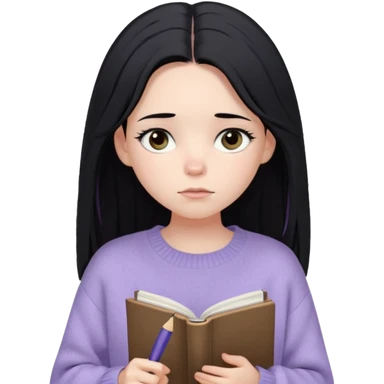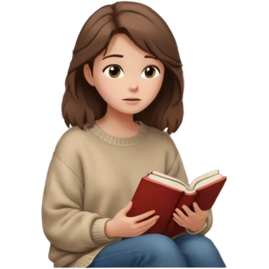 Cewe Overthinker Sweater oversized, rambut agak berantakan natural, duduk dekat jendela sambil pegang buku/jurnal, tatapan kosong mikir. emoji