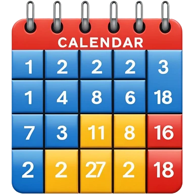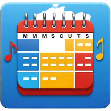 Flat icon, bright rectangular background with abstract color blocks (blue, yellow, red), black silhouette of a calendar grid, small musical notes around it, style of performing arts college logo, clean bold shapes, no gradients, high contrast, dynamic artistic composition. emoji | AI Emoji Generator