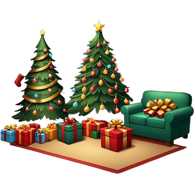 Flat illustration, livingroom with fireplace, christmas tree lit up and gifts under tree. Room is lit poorly but by the christmas tree lights, still life