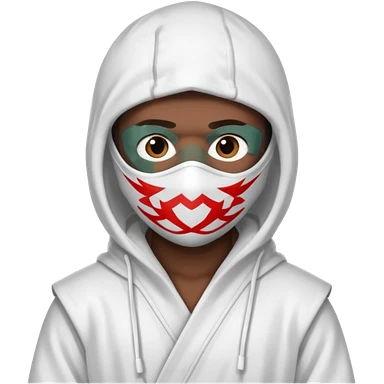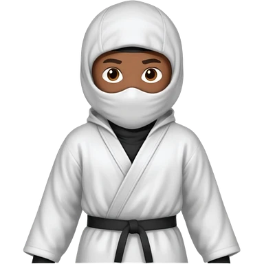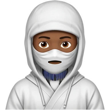 All white ninja robe with no black with white ski mask to cover face and neck with a hoodie on and dark brown skin color emoji