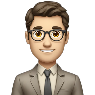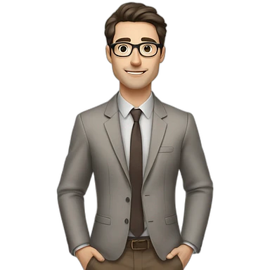 Pale skinned fit man with dark brown hair in gray jacket, beige office shirt, brown tie, brown pants and vintage glasses Writing text on the flipchart emoji