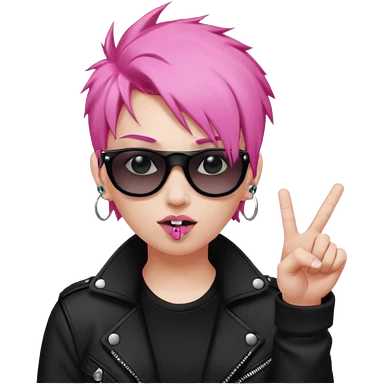 A pink haired punk flipping the bird and mouthing the f sound with black clothes and a pair of black sunglasses and piercings emoji
