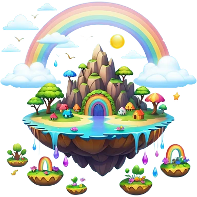 Floating islands with playful creatures, rainbow skies, soft magical lighting, 8K, no emoji icons, no emoji faces, still life emoji