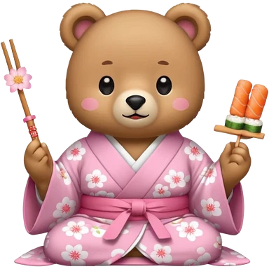 A cute light-brown bear wearing a pastel pink sakura-patterned kimono, normal balanced body ratio. Happily eating sushi with chopsticks, excited sparkling eyes. Kawaii emoji style, minimalistic clean sticker illustration, white background. emoji