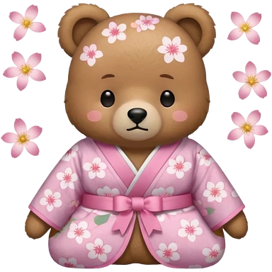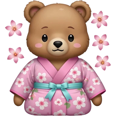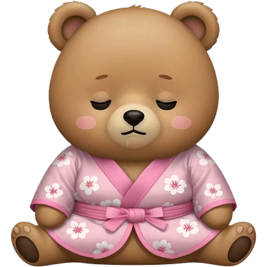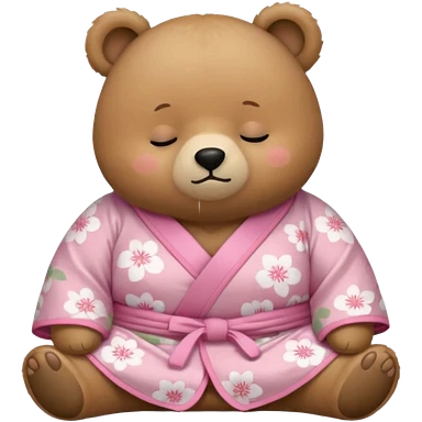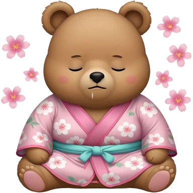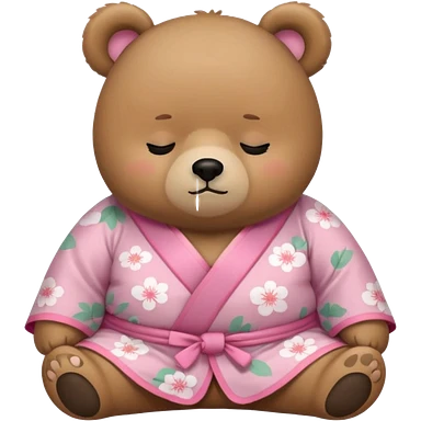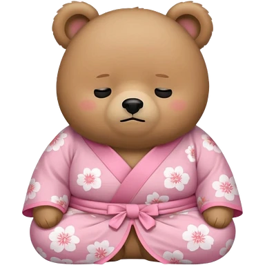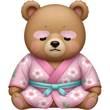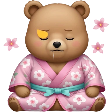 A cute light-brown bear wearing a pastel pink sakura-patterned kimono with a small ribbon on the back, normal balanced head and body proportions, sleepy half-closed eyes, mouth slightly open in a drowsy expression, tiny “zzz” floating near the head, a couple of sakura petals around emoji